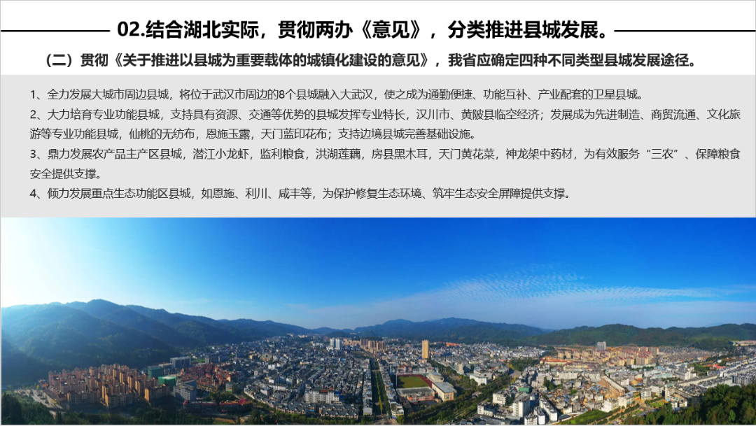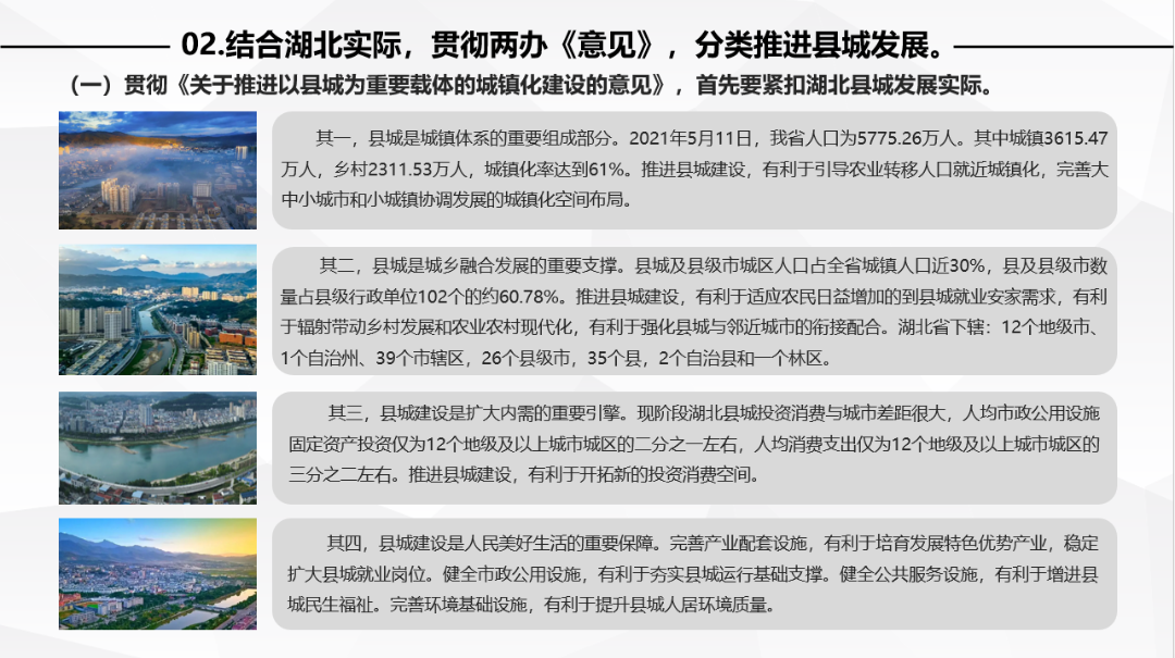常夢醒從政策角度為我們解讀縣城發展機遇,并結合實際以湖北省的縣城為例,介紹了五類縣城的發展方向。她提到當前我國縣城數量大、類型多、發展路徑各不相同,縣城建設不能一刀切,要分類指導、因地制宜。同時,做好基礎設施、公共服務、市政公用設施等人居環境保障,把人留下來。通過制度創新,創造良好營商環境,吸納社會資本和產業集聚。