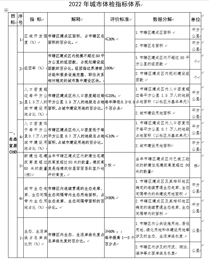 從生態(tài)宜居、健康舒適、安全韌性、交通便捷、風(fēng)貌特色、整潔有序、多元包容、創(chuàng)新活力等8方面建立城市體檢指標(biāo)體系(見附件2)。樣本城市可以結(jié)合新冠肺炎疫情防控、自建房安全專項整治、老舊管網(wǎng)改造和地下綜合管廊建設(shè)等工作需要,適當(dāng)增加城市體檢內(nèi)容。