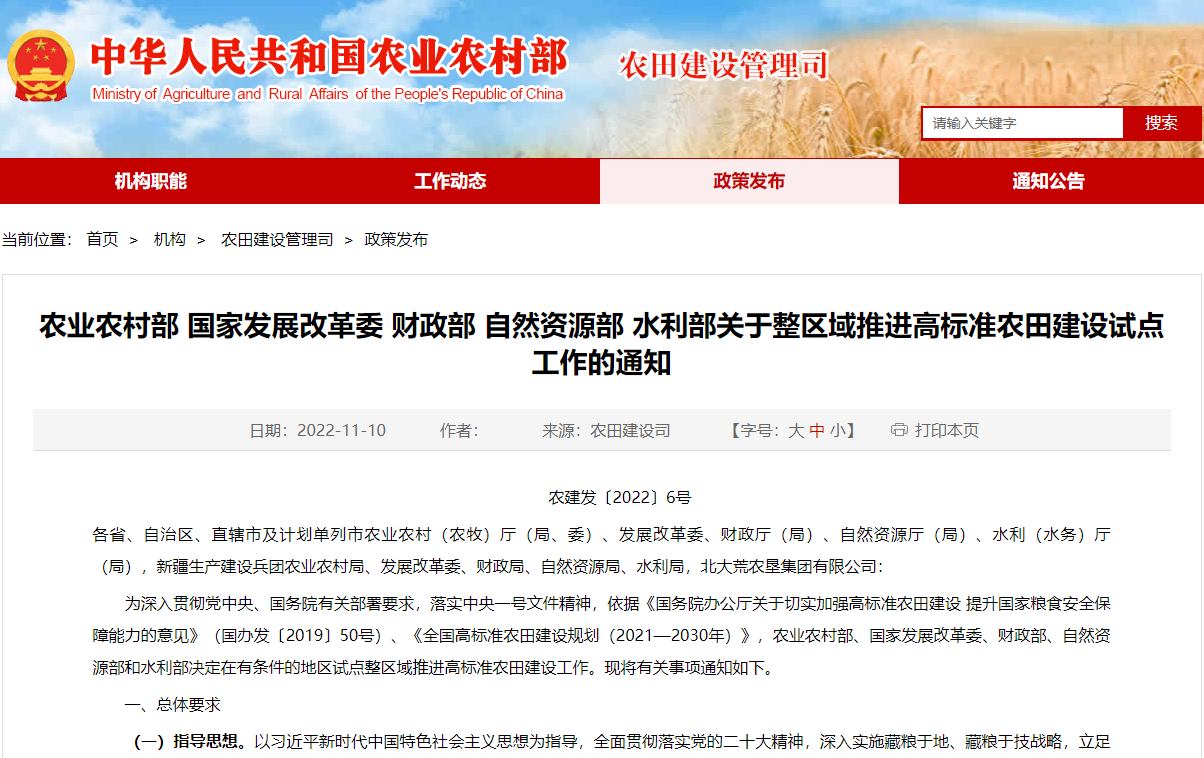 為深入貫徹黨中央、國務院有關部署要求,落實中央一號文件精神,依據《國務院辦公廳關于切實加強高標準農田建設 提升國家糧食安全保障能力的意見》(國辦發〔2019〕50號)、《全國高標準農田建設規劃(2021—2030年)》,農業農村部、國家發展改革委、財政部、自然資源部和水利部決定在有條件的地區試點整區域推進高標準農田建設工作。現將有關事項通知如下。