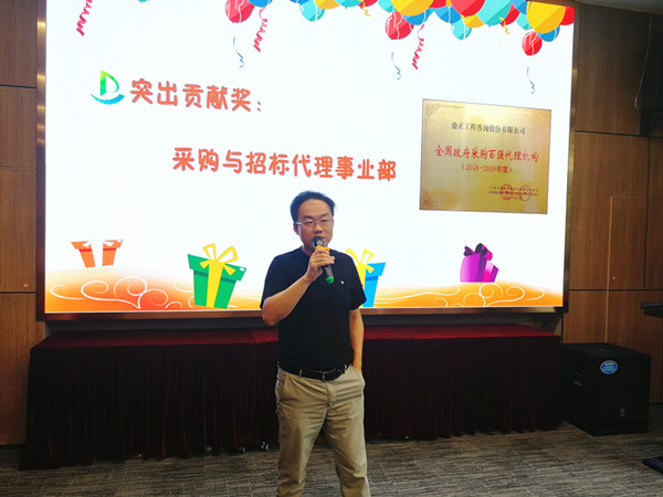 值得一提的是,今年七月我司憑借專業(yè)的服務(wù)、完善的內(nèi)控制度從近千家政府采購(gòu)代理機(jī)構(gòu)中脫穎而出,獲得首屆“全國(guó)政府采購(gòu)百?gòu)?qiáng)代理機(jī)構(gòu)(2018-2019年度)”榮譽(yù)稱號(hào),這一榮譽(yù)稱號(hào)離不開(kāi)采購(gòu)與招標(biāo)事業(yè)部全體成員積極主動(dòng)的參評(píng)。董事長(zhǎng)王雁然為采購(gòu)與招標(biāo)事業(yè)部頒發(fā)突出貢獻(xiàn)獎(jiǎng),并號(hào)召大家向采購(gòu)與招標(biāo)事業(yè)部學(xué)習(xí)大局意識(shí)和吃苦耐勞的工作作風(fēng)。