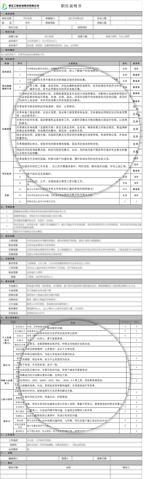 職位說明書貫穿于鼎正人資工作的各個環節,如招聘錄用、績效管理和考核、員工晉升及定薪調薪等,同時也是制定培訓計劃的依據之一。