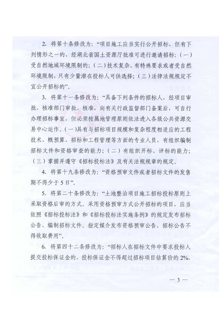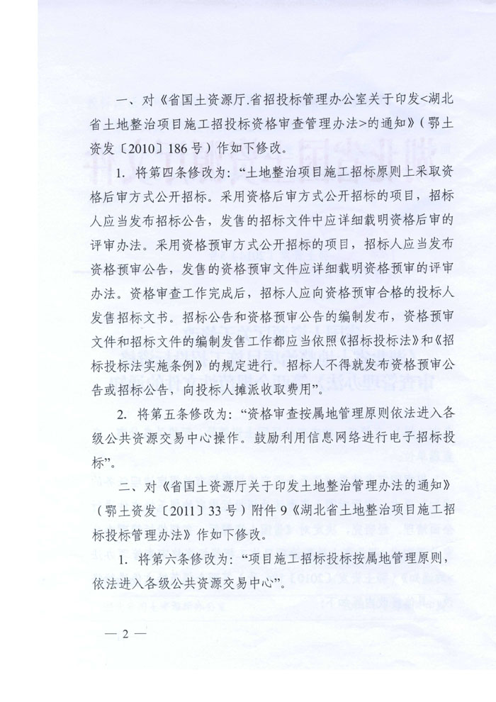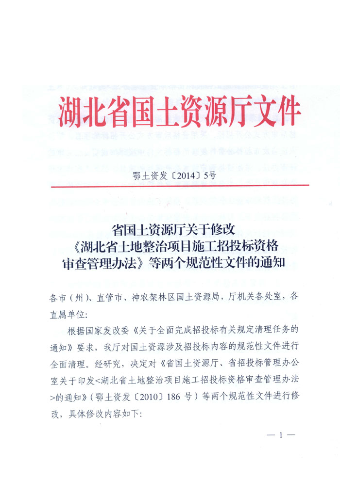湖北省國土資源廳關于修改《湖北省土地整治項目施工招投標資格審查辦法》等兩個規范性文件的通知