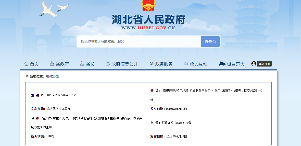 4月19日,湖北省人民政府網發布省人民政府辦公廳關于印發《湖北省推動大規模設備更新和消費品以舊換新實施方案》的通知