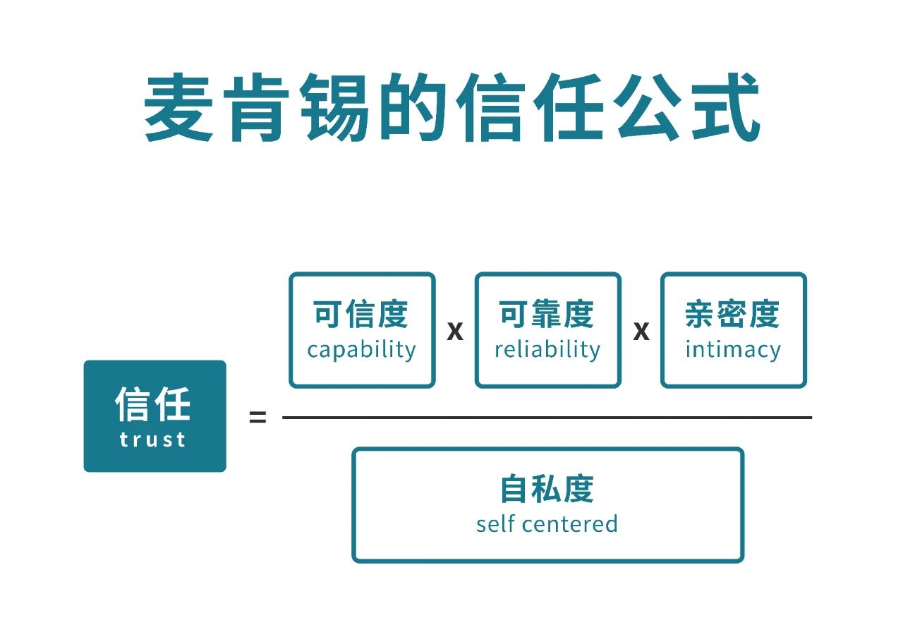 麥肯錫信任公式為我們對信任度進行量化評估提供了指導框架。根據影響信任的4個因素,我們了解到,信任是藏在尋常日子里的點滴小事,也是在一件又一件的小事情中積累起來的一種相互關系。