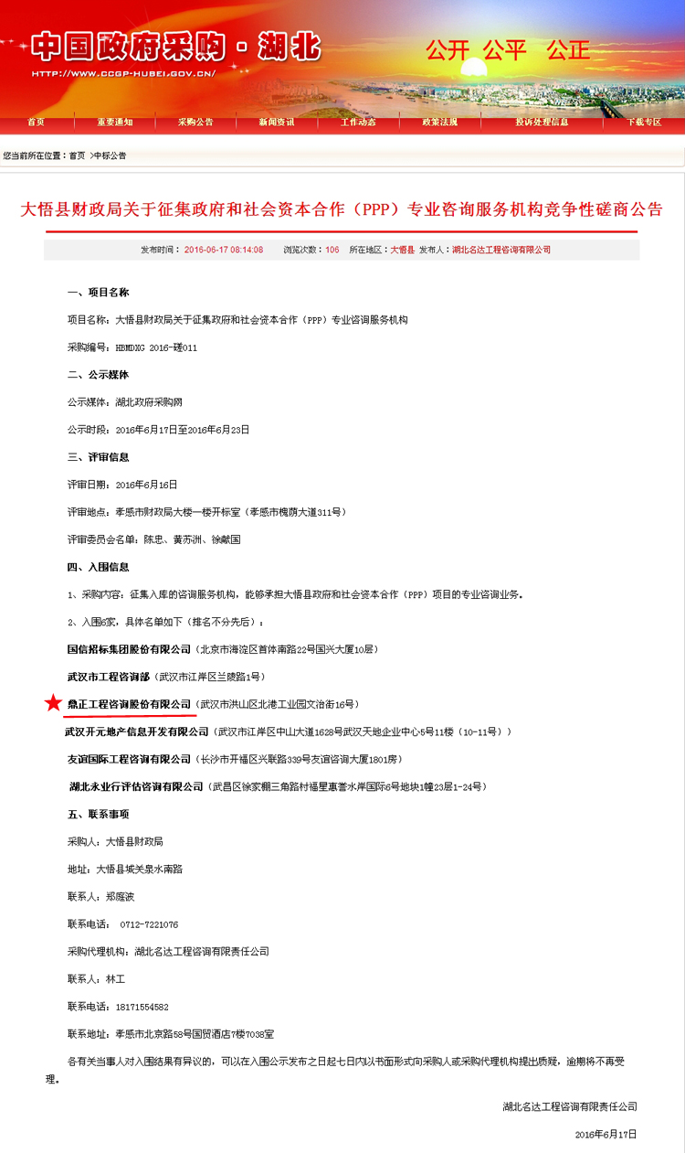 【經(jīng)營成果】我司入圍大悟縣財(cái)政局關(guān)于征集政府和社會資本合作(PPP)專業(yè)咨詢服務(wù)機(jī)構(gòu)