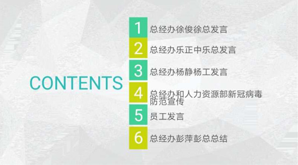 本次會議由人力資源部譚蓉主持,每位同事從自己的生活狀態到對工作的匯報和對戰勝疫情的決心中娓娓而談,閑話家談中表達出自己對未來生活的美好祝愿。